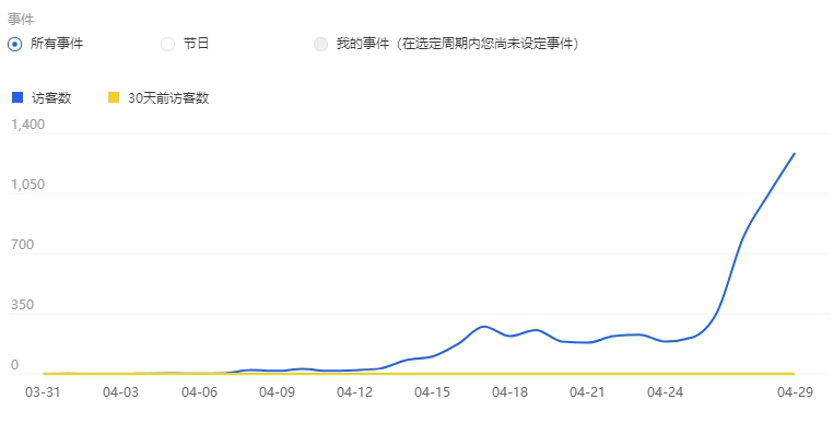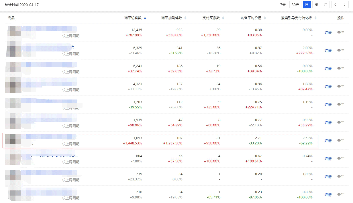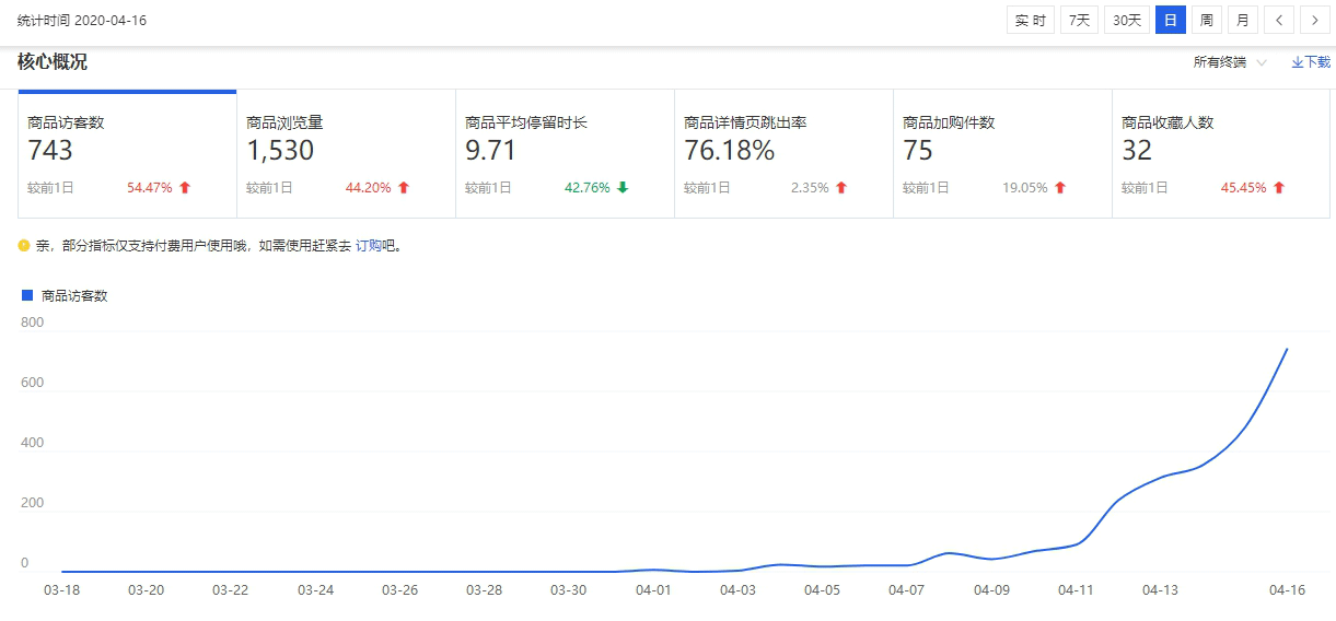 这是一个4月3日上架的款,上架后就0销量上车测款。通过一轮初步的图片测试,提升权重,商品的流量起来得很快。