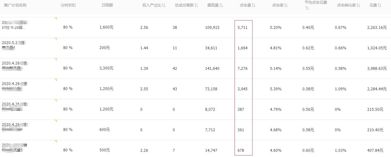 大约过了一周左右的时间,测试计划的权重起来了,就开始加计划了。先是4个计划,每个计划200个词加满跑。开始准备拉升流量打爆款。