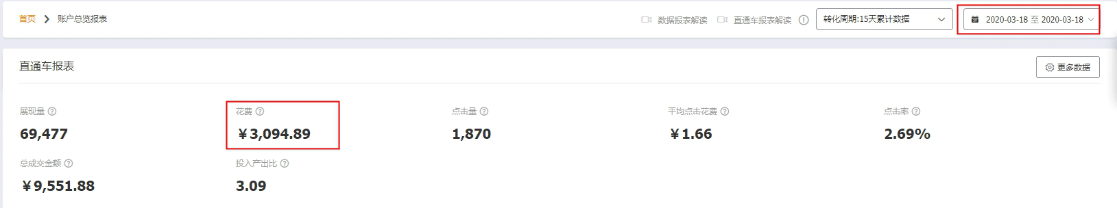 分析3.18日的数据直通车推广花费3094,当天投产3.09,直通车已经可以盈利。