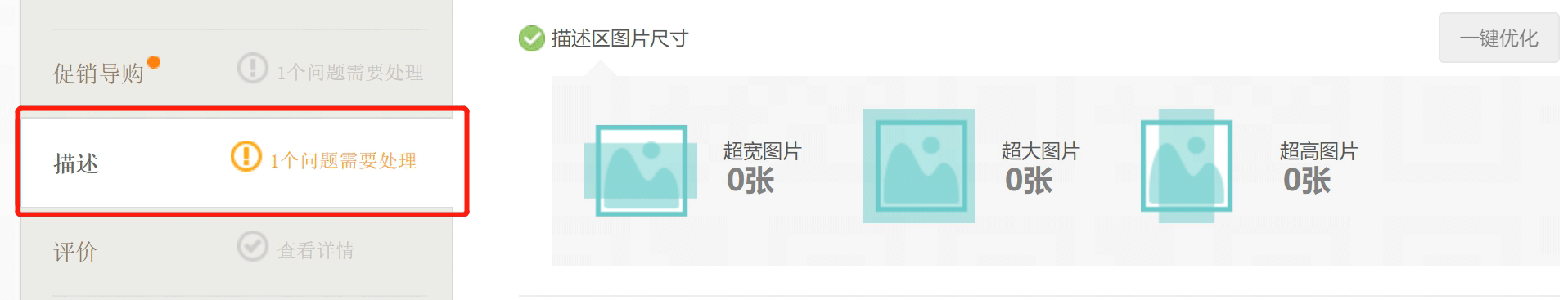 在生意参谋后台的商品诊断里面,有一个商品温度计,选择好单个产品后,再找到描述,就可以看到它对图片大小的诊断,不要出现超大、超宽、超高的图片。