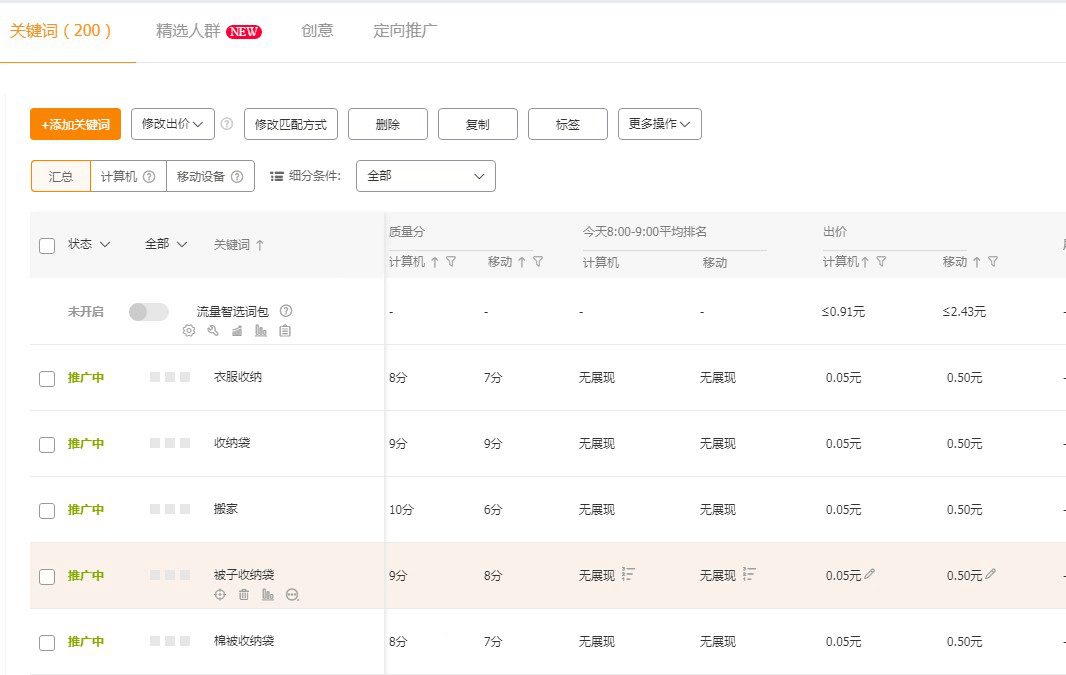 2、对于不同的关键词反馈效果,可以单独调词的出价