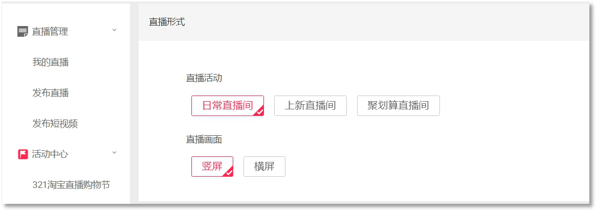 日常直播:平常直播选择,对发布宝贝没有要求,可自由发起直播,建议日常开播选择。