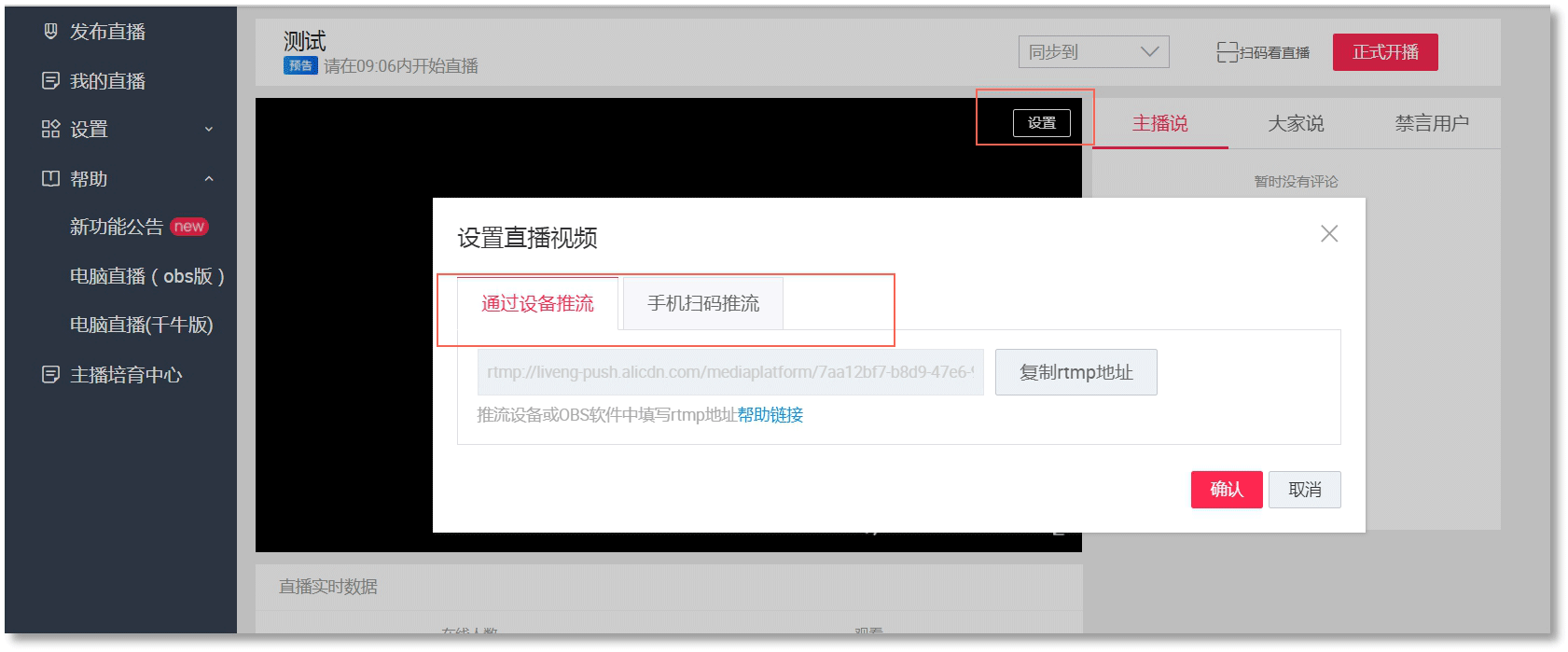 在这个界面,你可以选择是通过设备推流还是手机扫码推流;