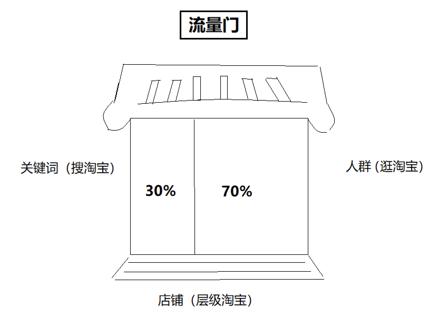 这里通过一个“流量门”模型图来展现淘宝流量的占比情况,如图1-2所示。