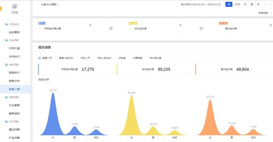 举例:比如竞品这个款式蛮好,我们店铺想上,那么先要分析一下产品背后的人群,这个产品核心关键词应该是雪纺连衣裙,碎花连衣裙。通过生意参谋-市场-搜索人群,分析这个核心词后面的人群,这个要专业版才可以,后面会介绍一个免费查看的。