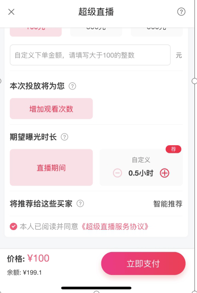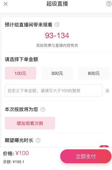 这里需要重点说明下,该渠道投放,超级直播单次投放金额100元起,系统会根据您的营销计划预估出本次推广能够给直播间带来的观看量。