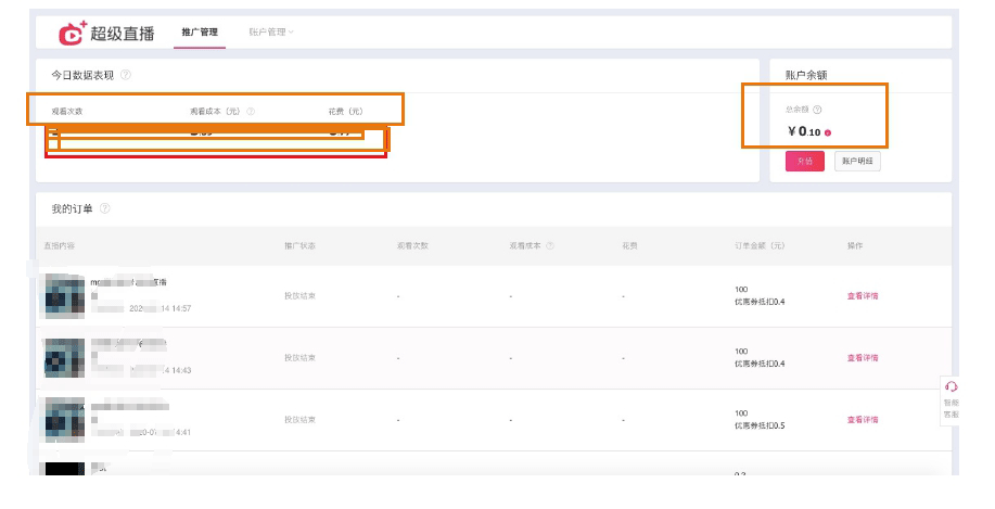 在订单管理页面中,您可以点击充值按钮提前为您的账户充值。也可以通过账户管理入口查看您的账户明细,但开票、退款、资质上传暂不可在移动端办理,需前往淘宝直播pc中控台办理。