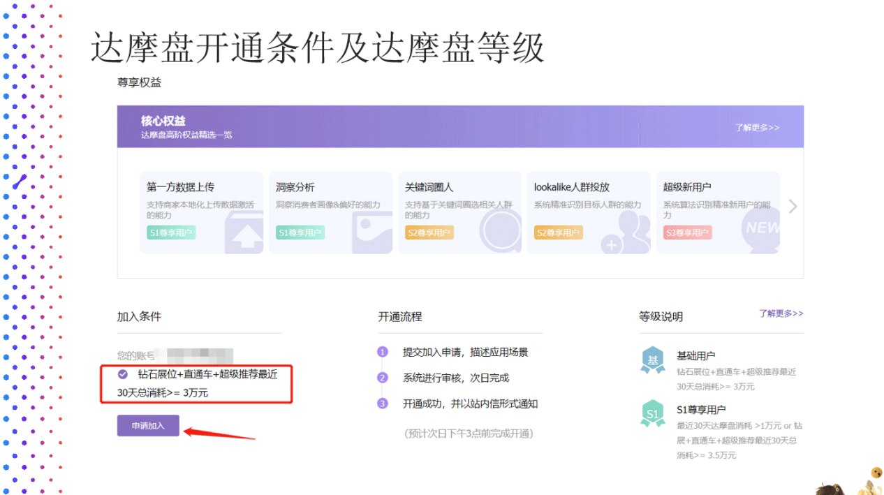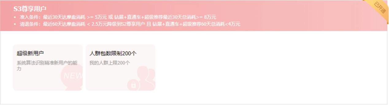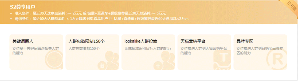 那么开通条件是什么呢?达摩盘消耗≥2万,或者钻展+直通车+超级推荐≥5万。