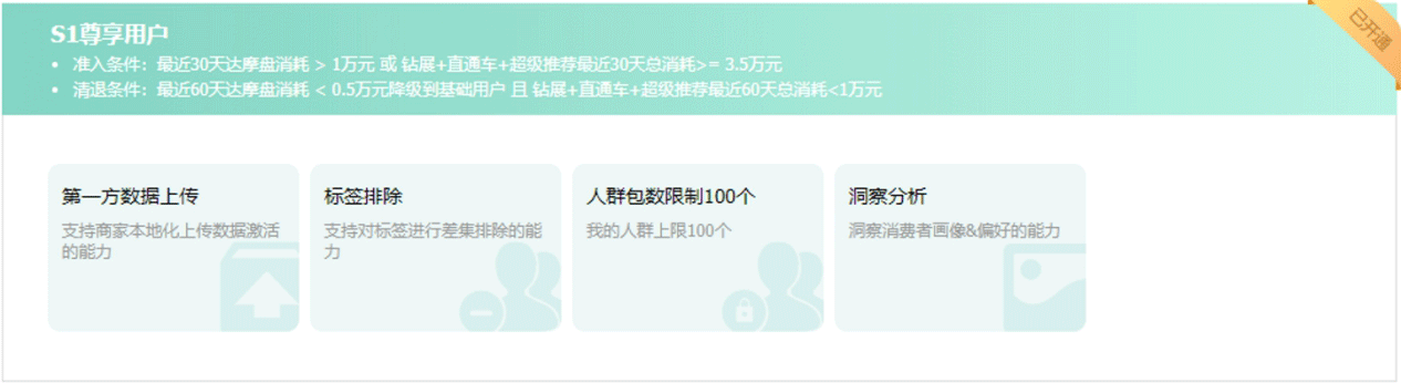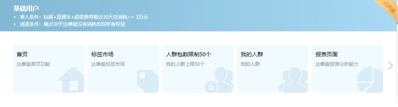 默认开通的是基础用户。刚开通的时候直通车+钻展+超级推荐总额达到3万就是基础用户,具有首页、标签市场、人群包50个,有我的人群以及报表页面等功能,核心功能是标签市场、人群包,我的人群。