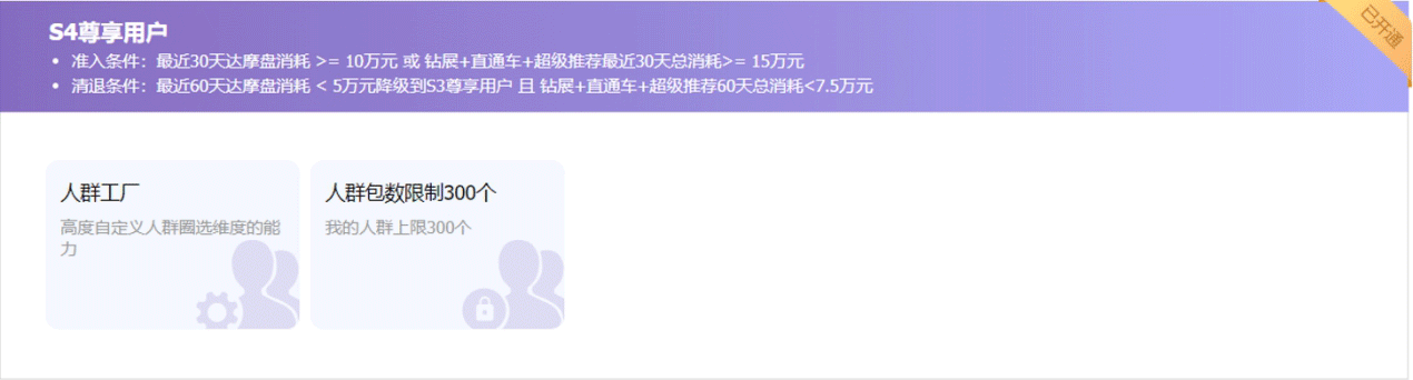 S4则需要消耗15万,门槛比较高。到了S4人群包增至300个,人群工厂开通。人群工厂这个功能好用是很好用,但是如果没有它,这些人群标签组合大部分还是能做出来的,所以到了S3和S4,我不建议大家冲了,但S2是期望大家都能冲到的,因为关键词圈人和lookalike人群投放确实太有用。