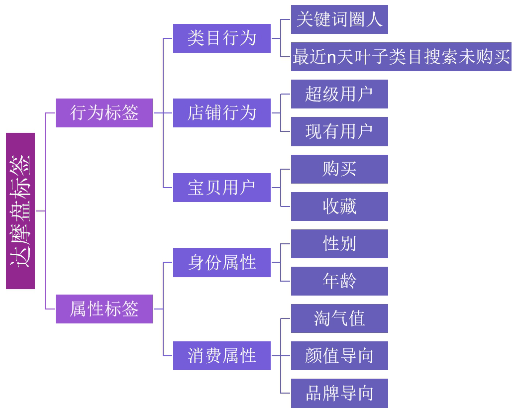 这些标签,你还可以做另外一个分类:直通车有的和直通车没有的。像有些标签比如性别、年龄、婚恋阶段、城市等级等等,直通车里有的可以直接投。不过这里面绝大部分标签直通车是没有的,那你只能打包好,同步给直通车,通过达摩盘投放,这就是他的全网标签。