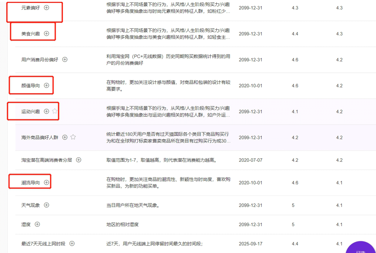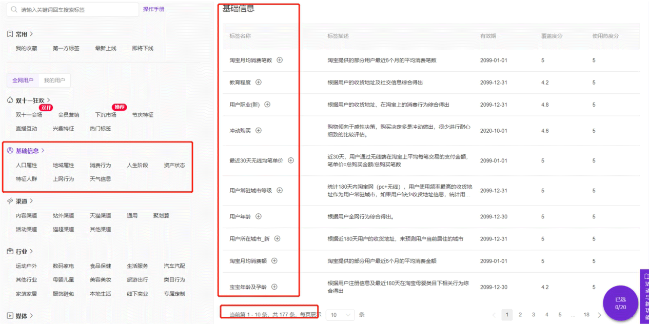 基础信息这里面都是属性标签,这里面的标签非常多,这些标签后面使用热度是五分,说明有很多商家都在用的,这个标签你看完之后再对比一下生意参谋后台的那些人群是不是丰富太多了。这里面只是基础信息就有177条!