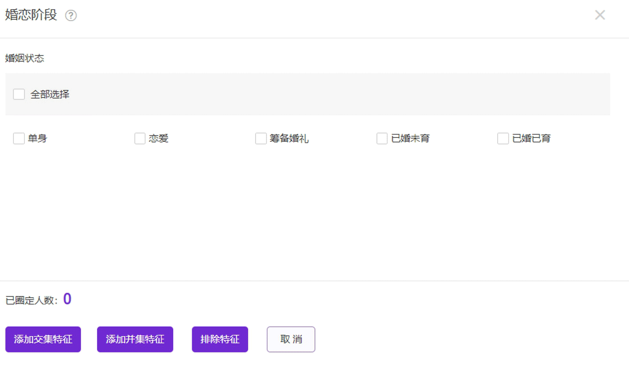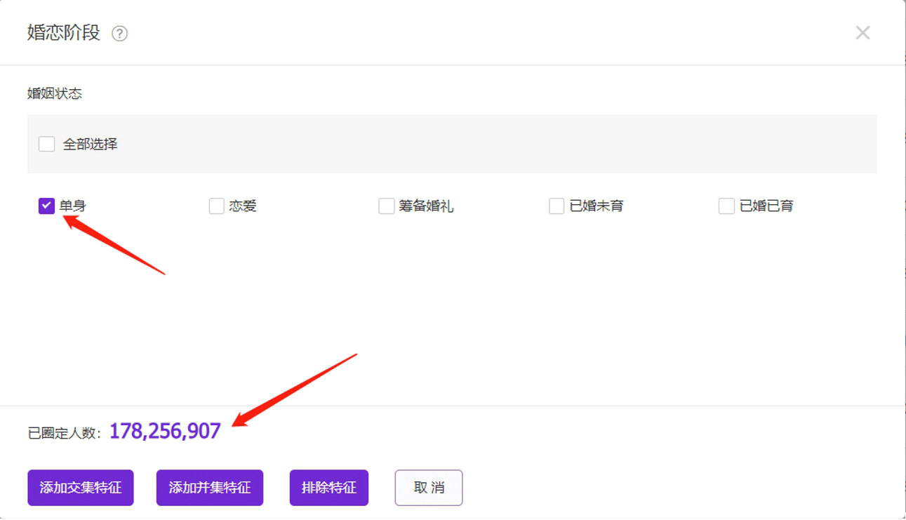 那你就知道了淘宝的婚恋阶段给人群打标,它属于人生阶段的标签,婚恋阶段有五种:单身、恋爱、筹备婚礼、已婚已育和已婚未育,这是直通车后台有的,可以投放。