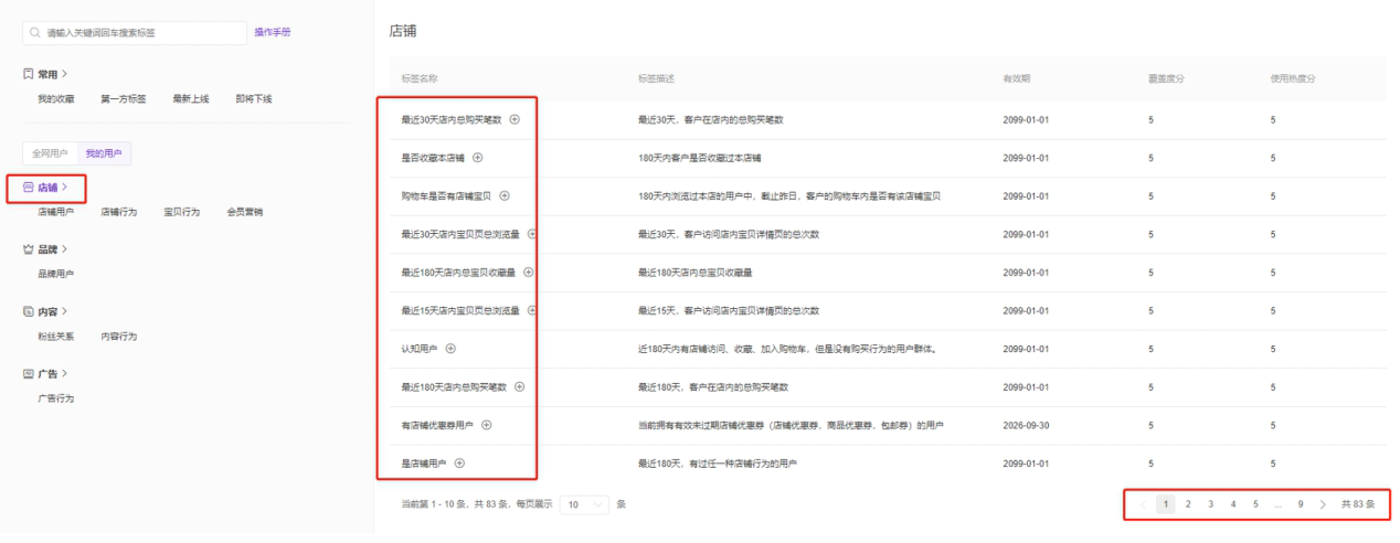 我的人群里面有什么呢?有跟店铺有关的,跟品牌有关的,跟内容有关的,跟广告有关的,比如说店铺,这里面就有店铺用户、店铺行为、宝贝行为和会员行为。在这里面还有很多很多的很多的标签,一共83个跟店铺相关的。