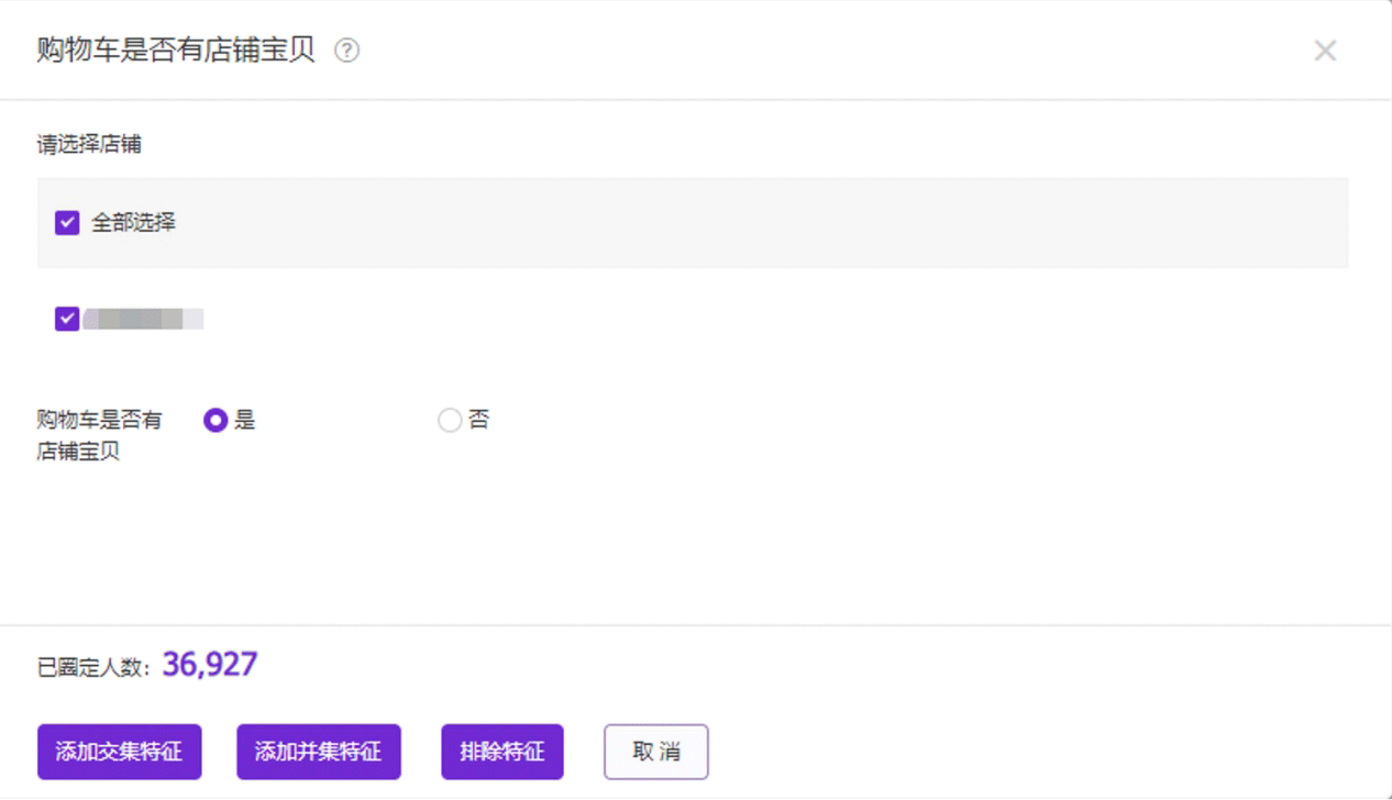 比方说购物车是否有店铺宝贝,你选“是”,那就说明有3万多人,他的购物车里面有你店铺里面的宝贝,他就是你店铺的新客。这些新客将宝贝加入购物车却不买,你就把这3万多人圈起来投放。