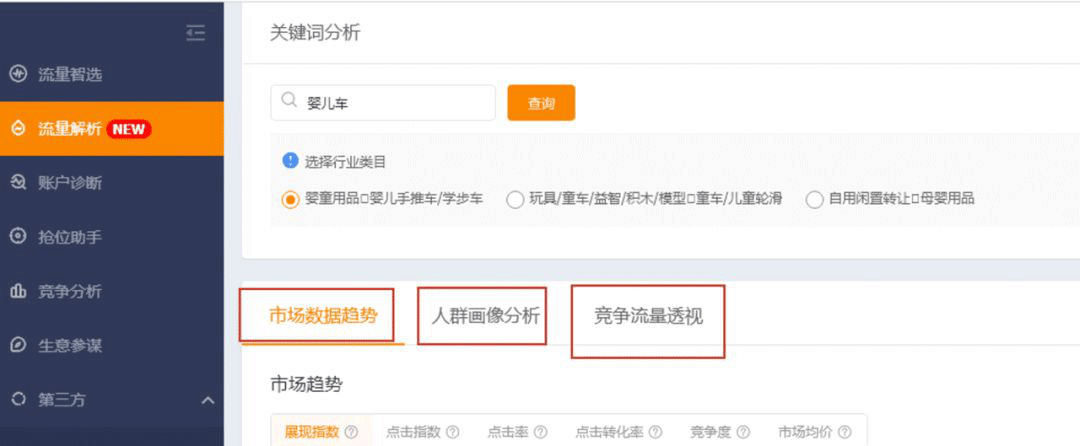 如果新手没有开过直通车,就在流量解析输入你的主要类目的关键词,选择竞争流量透视