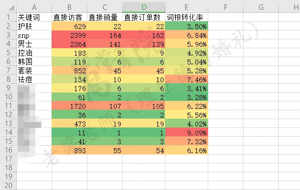 分析出来的数据,也可以加入词根转化率的一个数据,可以自己计算一下的,之后再选择条件格式,标注一下色阶,这样可以很显著的看出关键词的数据情况。