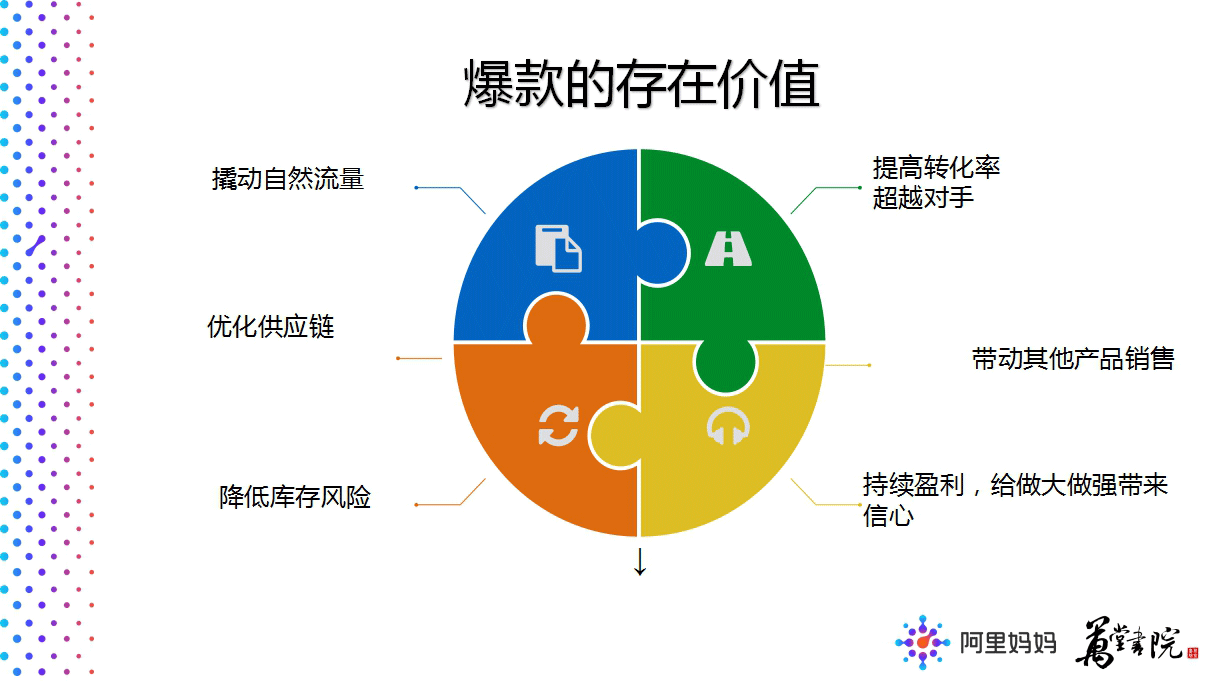 对于我们做电商的来说,爆款商品不仅仅意味着销量的提升,更是能够带动整个店铺全店产品的关联销售,对降低库存风险、优化供应链、撬动自然流量、提高转化率超越竞争对手、带动其他产品销售、做大做强带来信心等方面起到非常大的作用。