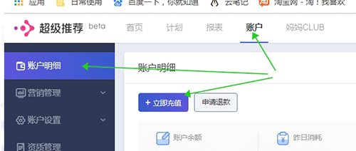 在超级推荐产品中,进入BP后台,点击【账户】可以查看到【立即充值】按钮,点击进入充值即可。