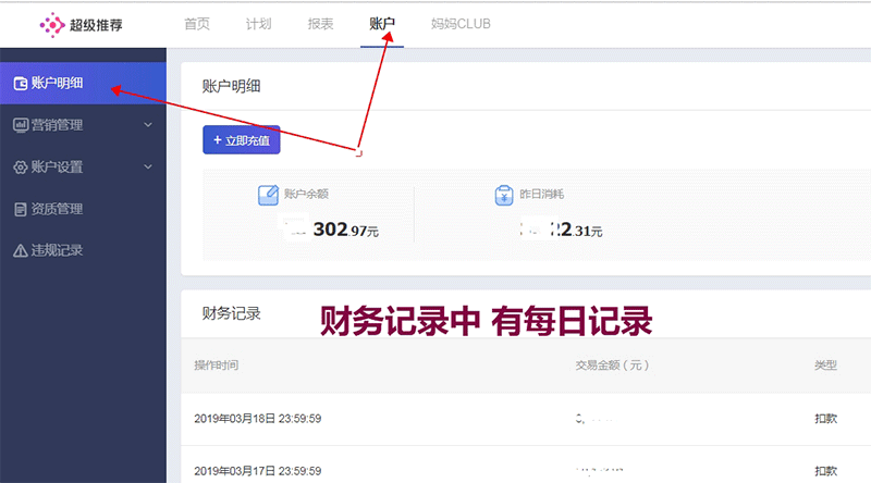 在【超级推荐】产品中,您可以登录后台-账户-账户明细查看(建议下载财务记录对每天的花费进行对照下)