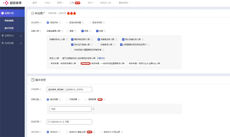 自定义自助设置定向、资源位、出价,创意等进行商品推广