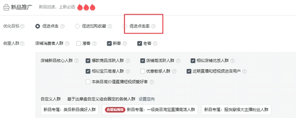 智能优化:超推会自动化完成整个优化过程,根据我们设置的优化目标,去优化我们想要获得的流量,有促进点击、促进收藏加购、促进成交,促进点击率,不同的策略方向不一样,但最终目的都是为了给产品引流、成交...一个新品前期选择促进点击才更有机会获取流量来激发产品标签。
