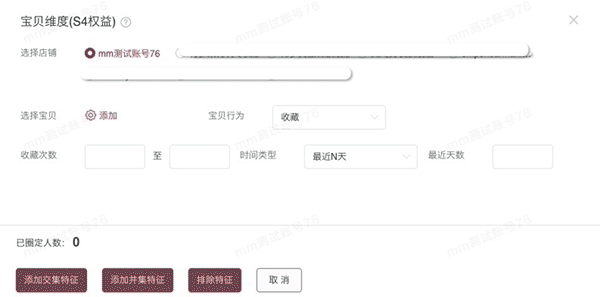②、达摩盘S4权益商家:支持标签的具体行为维度(浏览、点击、加购、收藏、购买等维度)、行为频次参数、时间维度(最近N天、时间区间)等进行自定义设置;
