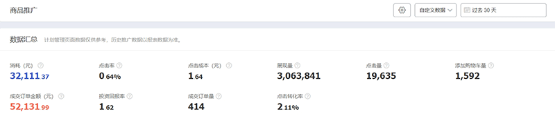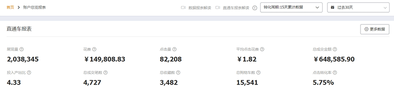 我们可以看到超级推荐的曝光量300万,远高于直通车的200万,并且花费只有直通车的约1/5。