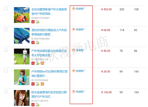 商家可以在出售中的宝贝列表寻找“极速推广”(如下图),