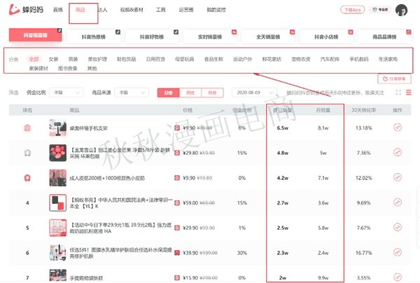 我们可以参考在抖音上面热销的产品类目,产品价格,