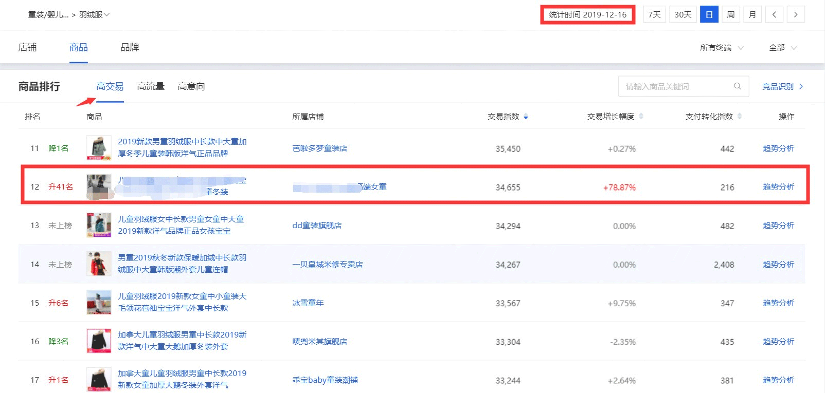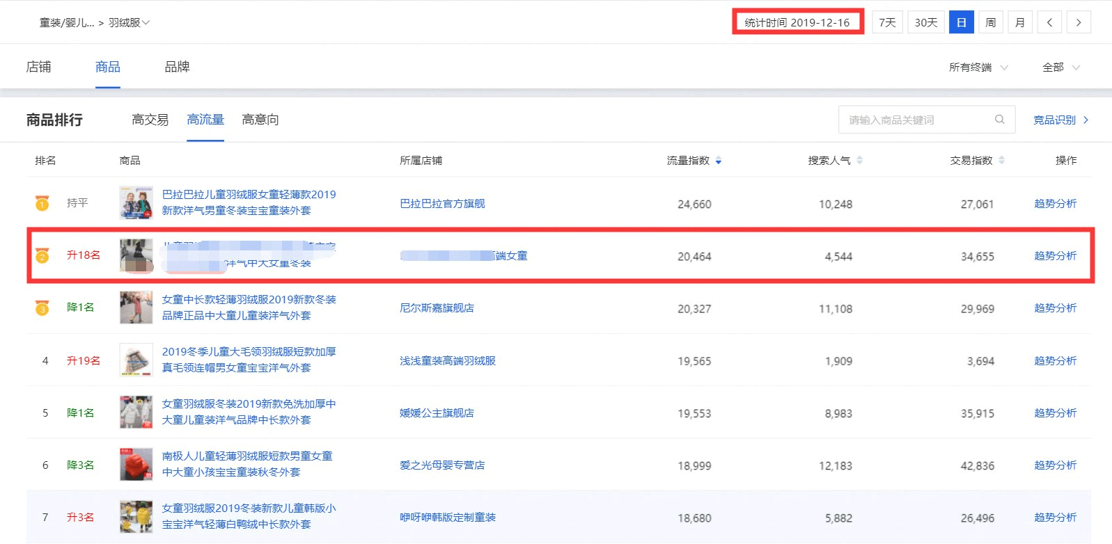 这个产品是童装类目的女童羽绒服,去年12月份新品上架12天我用超级推荐来推广做到行业高流量榜第二的位置。