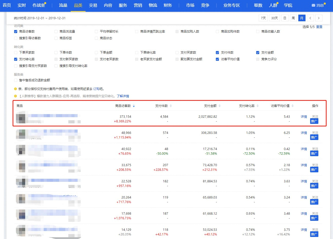 通过生意经中的趋势可以看出来这个单品从12月4日上架时的0访客用12天快速的拉升到了后面的日均两万访客以及日均销量在400单左右。而且这个款的客单价是500以上,也就是说单款 快速的做到了20万的日销售额。