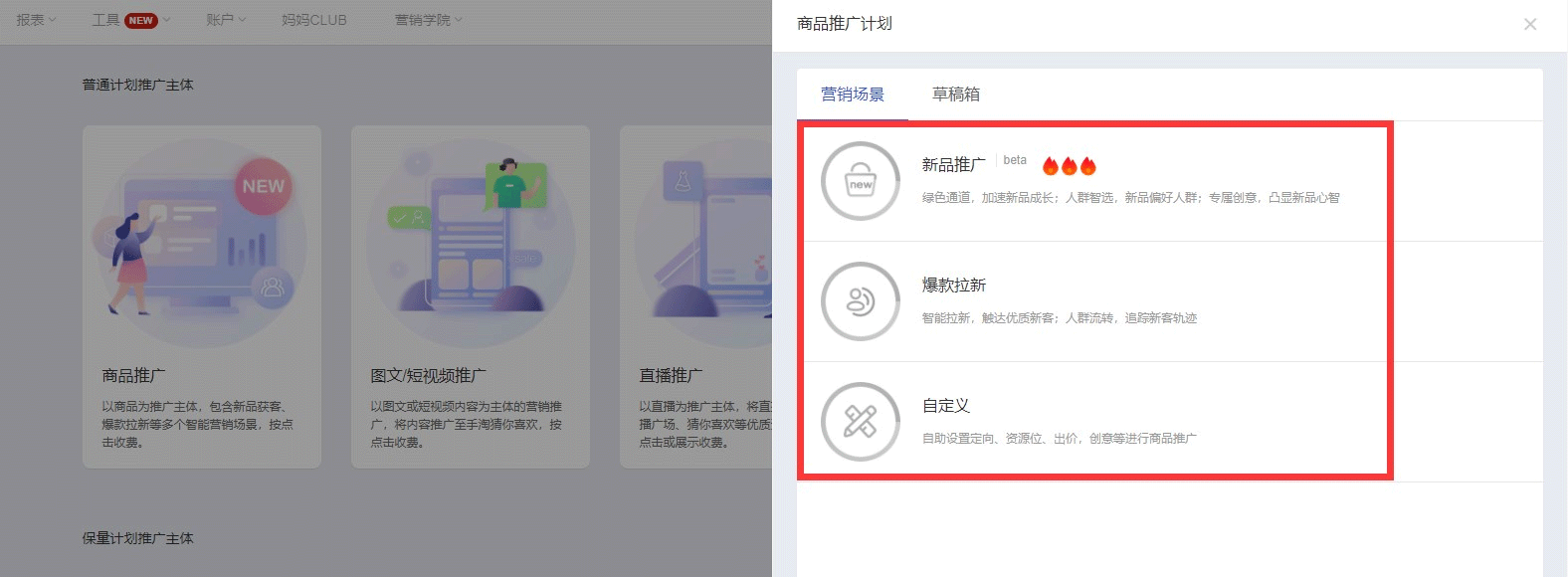 对于爆款来讲最缺的就是流量,那我们常规的计划类型有新品推广 爆款拉新 自定义三种