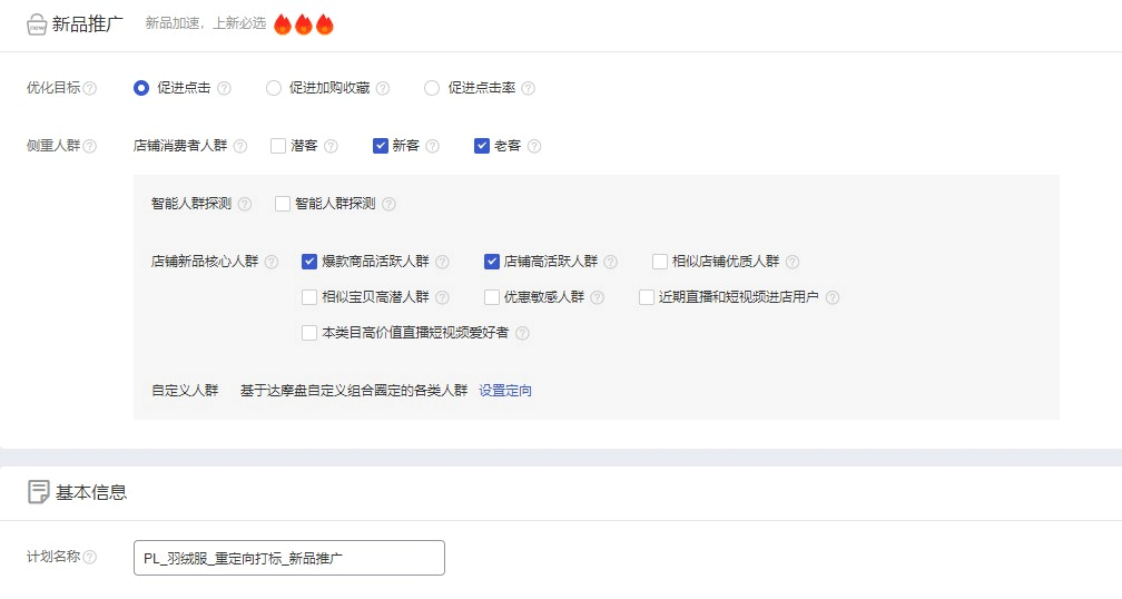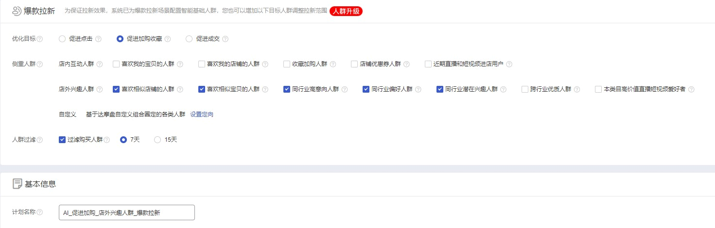 侧重人群选择新客+老客+爆款商品活跃人群+店铺高活跃人群,优化目标选择促进点击或促进收藏加购,具体看你需要的流量体量。促进点击的流量体量大于促进收藏加购。