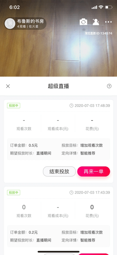 推广开始后,您回到直播间重新点击底部更多,在工具栏里点击“直播推广”按钮即可进入实时订单查看页面,可以看到推广的实时数据(1-2分钟延迟)。同时,您也可以点击结束按钮结束推广或者点击再来一单按钮新建计划。