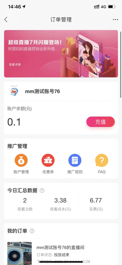 1.2,在直播列表页面也可以找到直播推广入口,创建推广和实时订单管理,如下图: