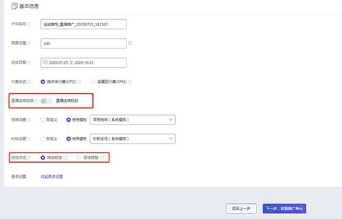 新出的一个功能,帮助提升推广设置效率,减少操作的繁琐,故在新建计划的环节新增了“连续投放”的按钮。