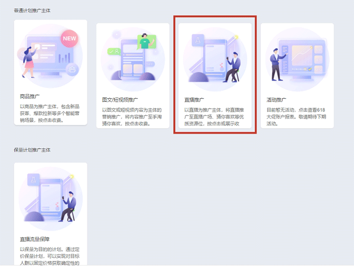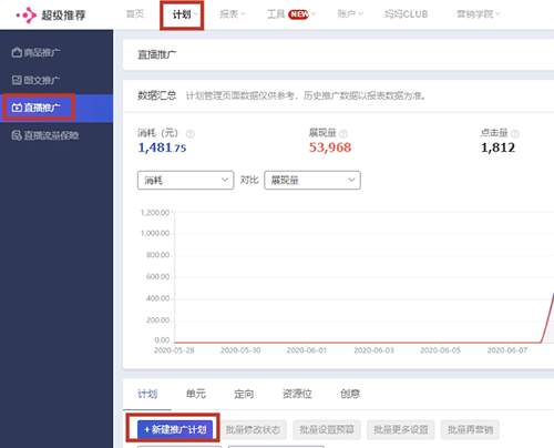 我们先来说说直播推广,创建的过程:计划——直播推广——新建推广计划——选择直播推广计划