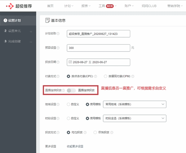 截止到这儿一个自定义直播推广计划就完成了,可在直播中根据数据进行出价和创意的优化。那超级推荐直播推广需要关注什么指标呢?