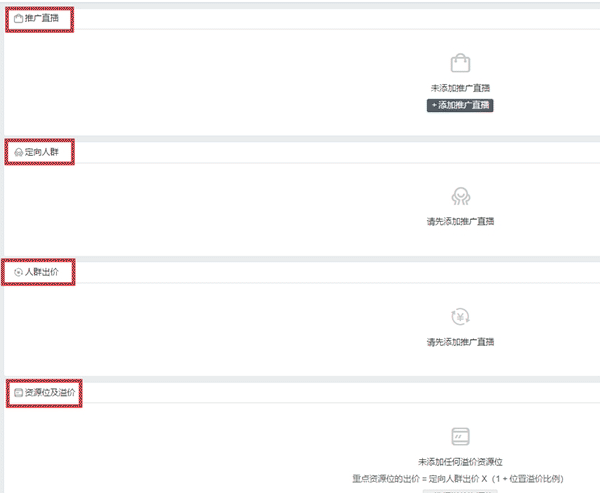 可添加要推广的直播间,添加想要触达推广的人群并选择对应资源位,并使用上传直播创意(直播间封面自动生成创意建议保留)。