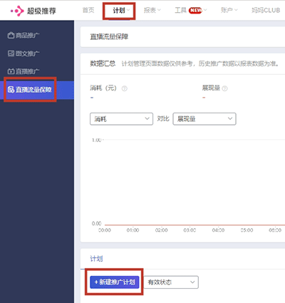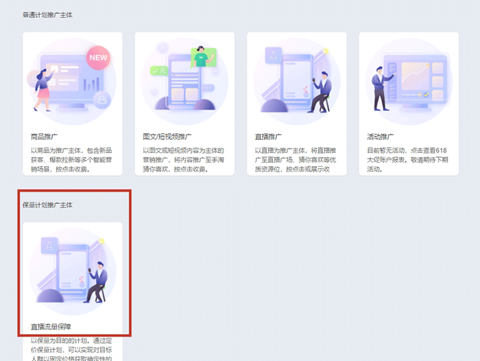 那我们继续说说直播流量保障计划,创建的过程:计划——直播流量保障——新建推广计划——选择直播推广计划