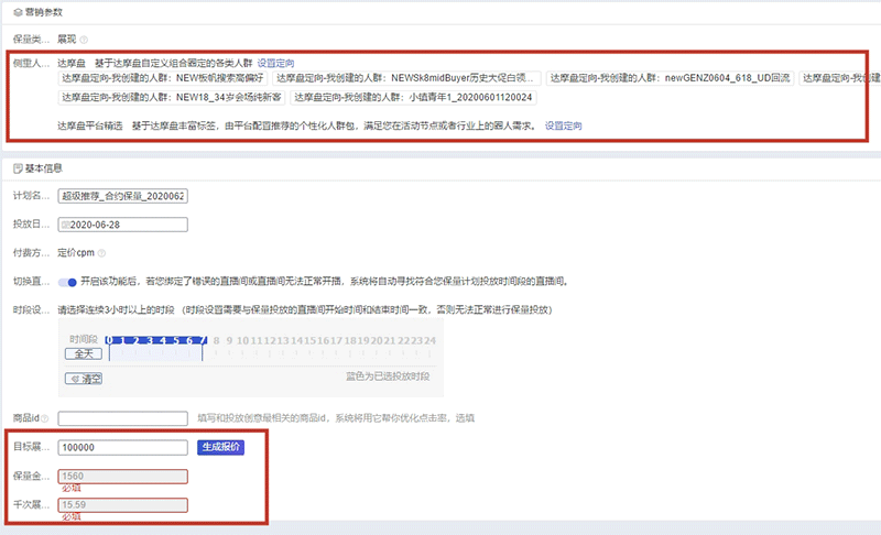 直播流量保障计划简而言之就是系统对商家设置的核心想触达的人群进行展现量的保障;基于目标人群量级和需求的目标展现量进行CPM和计划最低最低起投金额的系统预算(注意,目标人群要尽量大);后续进行直播间的绑定和创意的上传即可。
