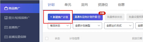 一、进入超推后台(卖家中心后台营销中心或tuijian.taobao.com),找到“新建推广计划”-选择商品推广,点击“新品推广-新建计划”(如下图):