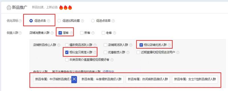 二、选择优化目标和侧重人群。新品推广属于智能化推广,系统会根据我们自己的营销诉求进行流量匹配(通过识别宝贝的标题及属性等基础信息来预估宝贝人群标签范围并进行人群推送)。