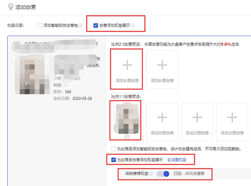 选择“创意权益展示”,勾选以后设置对应的优惠券信息,系统会自动将优惠信息显示在创意图上(优惠券优惠额度必须要≥10元才有效,否则无法展示)。
