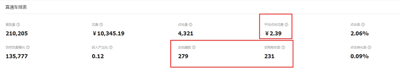 开了极速推后,效果明显有所好转(极速推平均点击花费0.34元,收藏加购成本为2.25元)。
