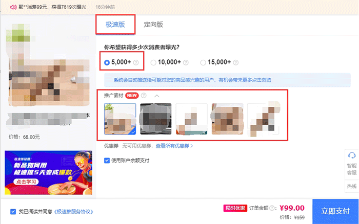 2、曝光量:选择5000+(99元),这相当于一个试探性的投放(极速推的流量推送逻辑是:第一次投放时会基于你当前宝贝的标题及图片来识别你推广的产品,从而广泛的为你匹配展现机会;