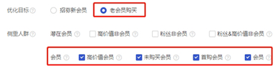 超级推荐商品推广的会员营销功能划分了会员和非会员两个目标体系,基于目标的选择就可以通过非会员人群和会员人群的匹配为宝贝带入精准流量;