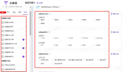 同时针对店铺产品会员周期购买稳定的店铺还可以通过达摩盘进行人群的精准圈选;通过精准的人群区分圈选,实现高效的会员人群营销引流;