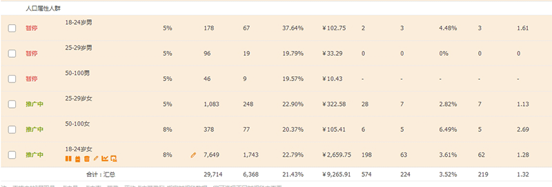 2、刚开始我们推了2天,发现这款产品男性占比起初还占据30%-40%的市场份额,于是迅速调人群方案。打开男性溢价,后面经过大量数据,发现这些都是偶然性。所以人群方面还是要不断的去分析验证。